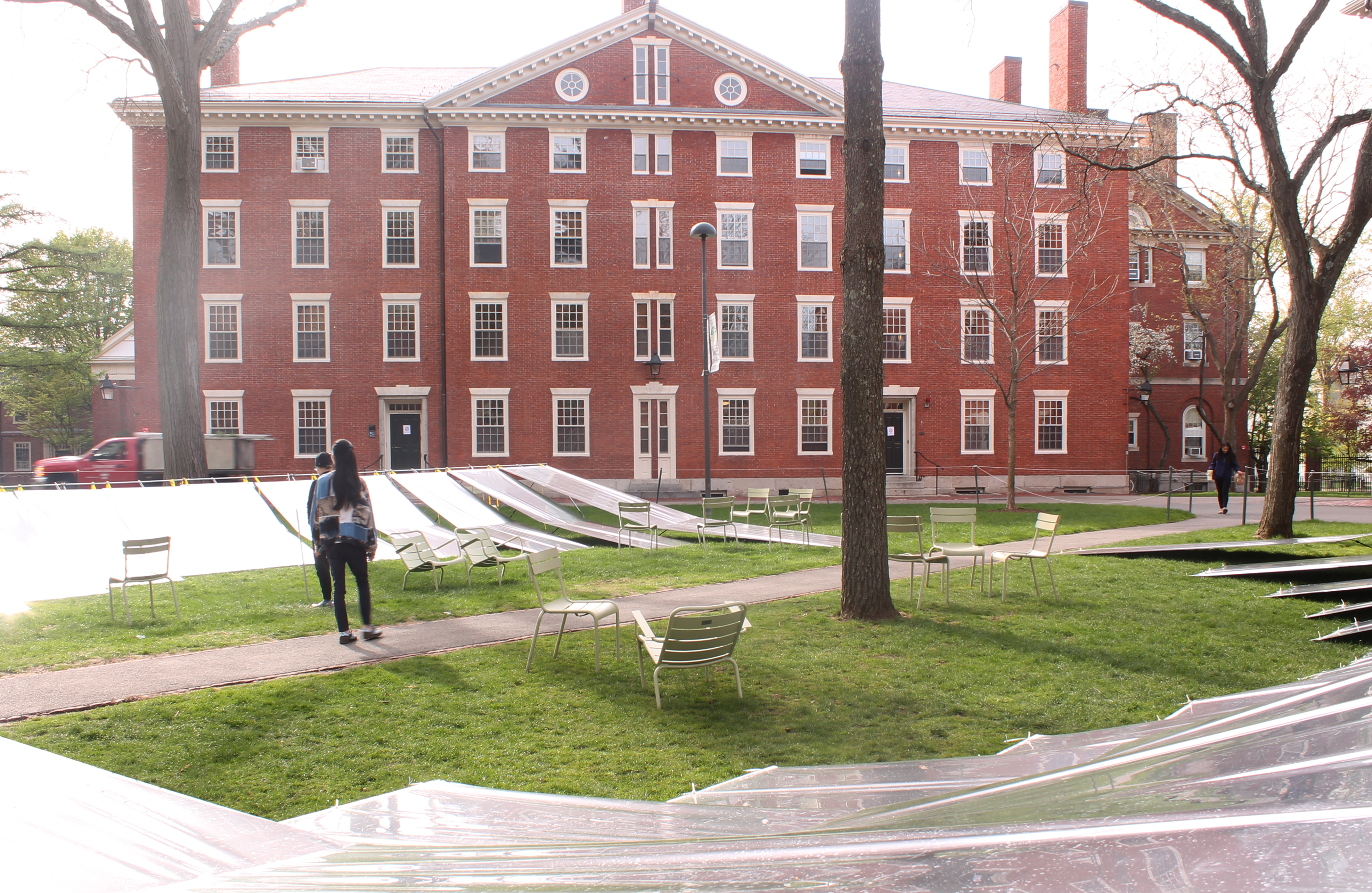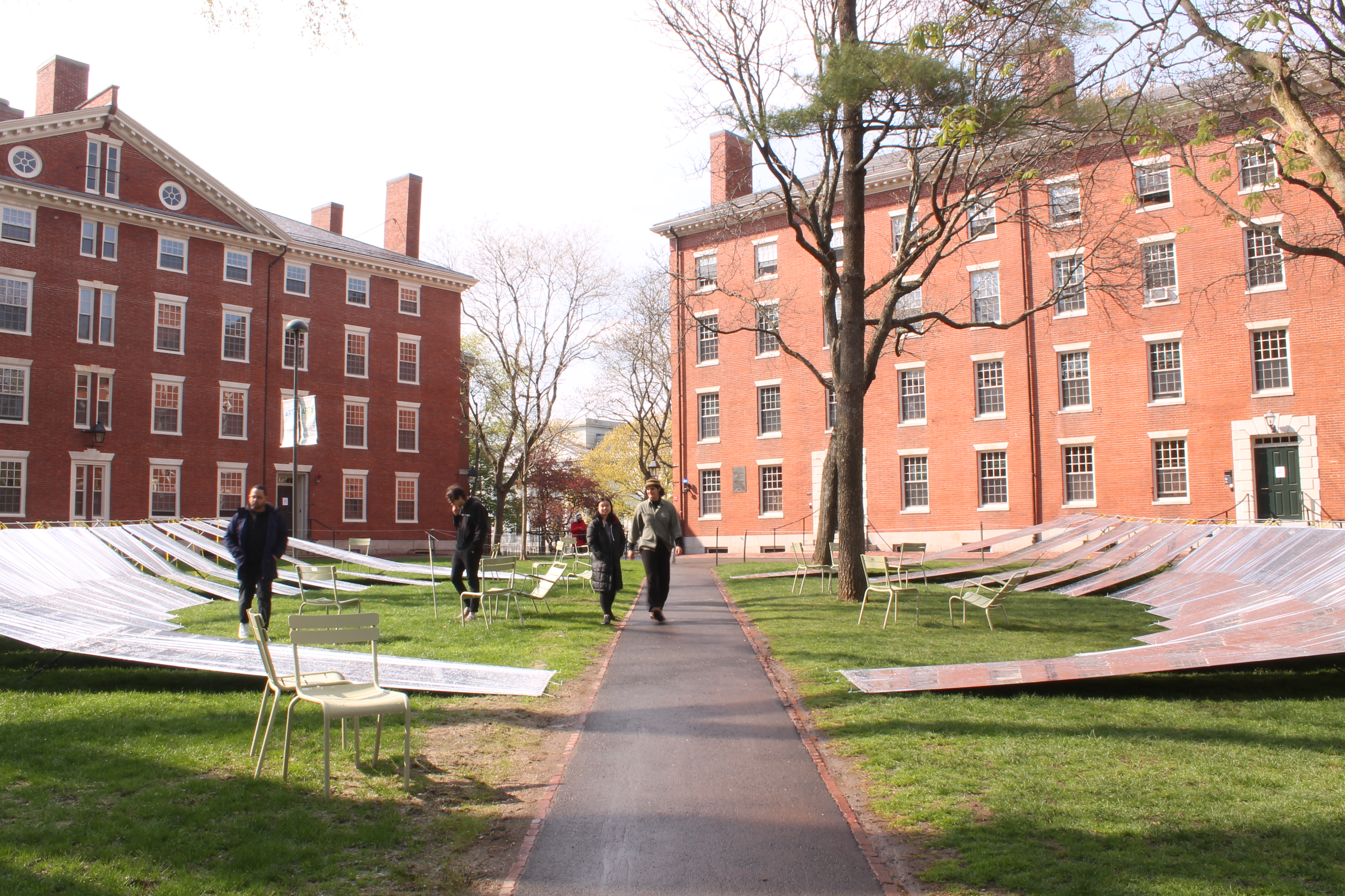 To accentuate its enclosed nature, the mylar skirts slope upwards, reaching eye level at the perimeter and generating a convex space that momentarily sunders visitors from the typical perception of Harvard Yard. Despite being overshadowed by the abundance of brick and vast expanses of greenery, Harvard Yard holds a homogeneous visual identity and social significance for Harvard University. Often overlooked by passers-by, the primary objective of this project is to provide visitors with an introspective experience that enables them to rediscover and reconnect with their environment.